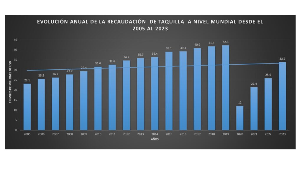 | EVOLUCIÓN ANUAL DE LA RECAUDACIÓN DE TAQUILLA A NIVEL MUNDIAL DESDE 2005 HASTA 2023 ( en millones de dólares) | |