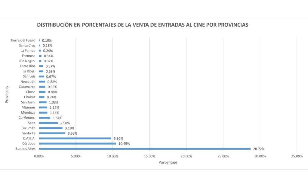 Gráfico 4: Distribución de las ventas de entradas por provincias: Nos muestra que el casi 50% de las entradas de cine vendidas en el país se concentran en: las salas de la provincia de Buenos Aires, Córdoba y la Ciudad Autónoma de Buenos Aires, donde en Córdoba se vende el 10% de las entradas del país.