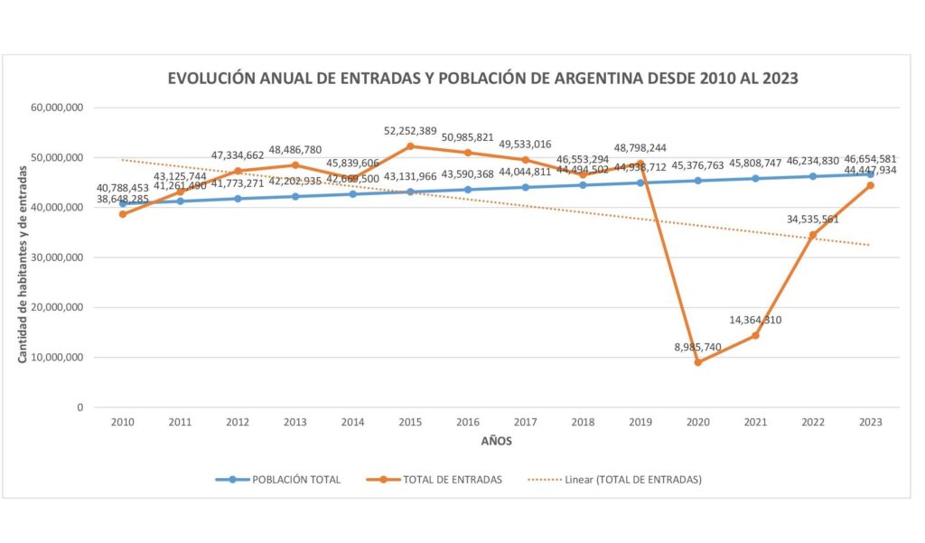 Se observa, que la cantidad de entradas vendidas es siempre superior al crecimiento poblacional, y también aparece el impacto de la pandemia y postpandemia.