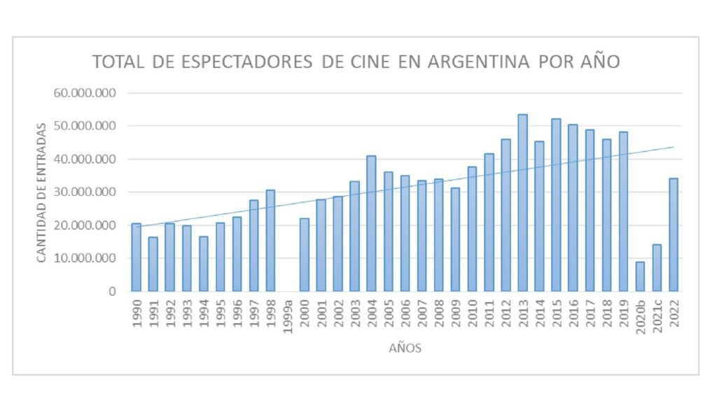 Gráfico 2: Muestra la cantidad de espectadores de cine en Argentina, desde 1990 al 2022. Observamos una tendencia creciente con su máxima venta de entradas en el 2013 alcanzando a 53 millones de entradas. También se observa, la caída y recuperación durante la pandemia y post pandemia.