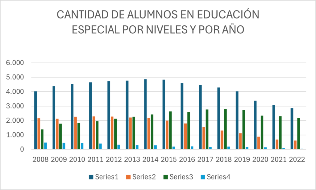 Como se observa, en el transcurso de 10 años y más, ha ido disminuyendo considerablemente (casi un 40 %) la cantidad de alumnos que asisten a establecimientos estatales de educación especial en la provincia de Córdoba, tendencia en baja que no se detecta de igual manera en el resto de las provincias y esto nos muestra que en la provincia de Córdoba el camino a hacia la inclusión plena está en marcha.